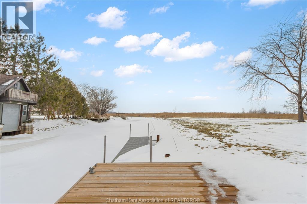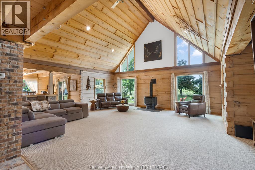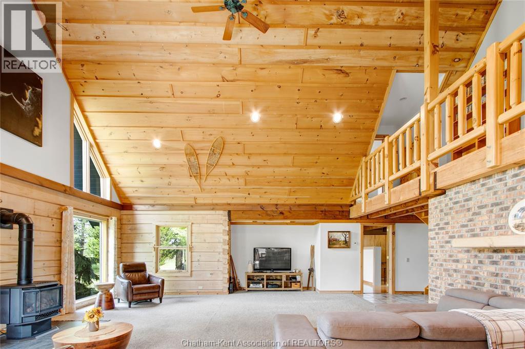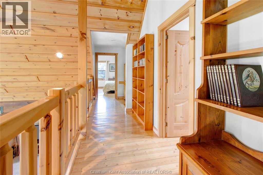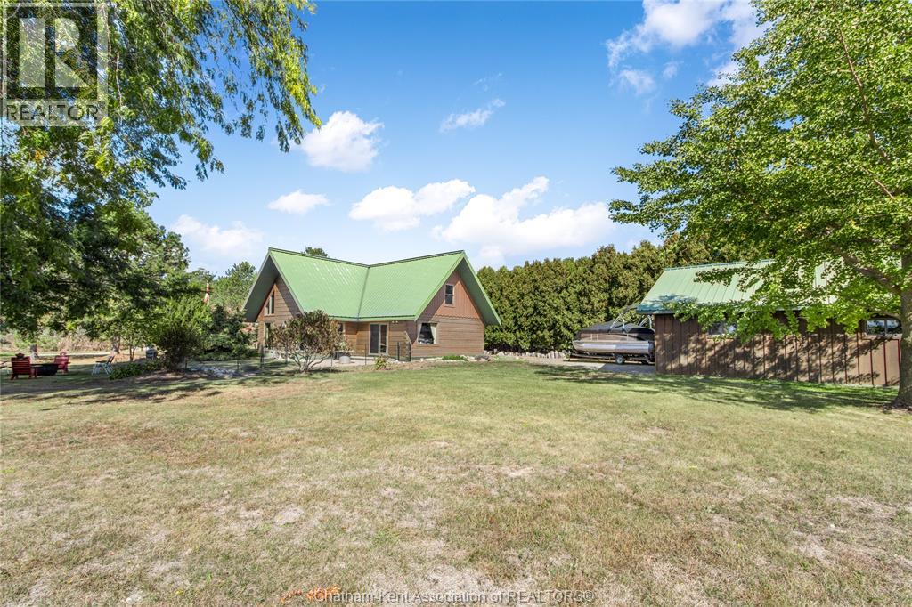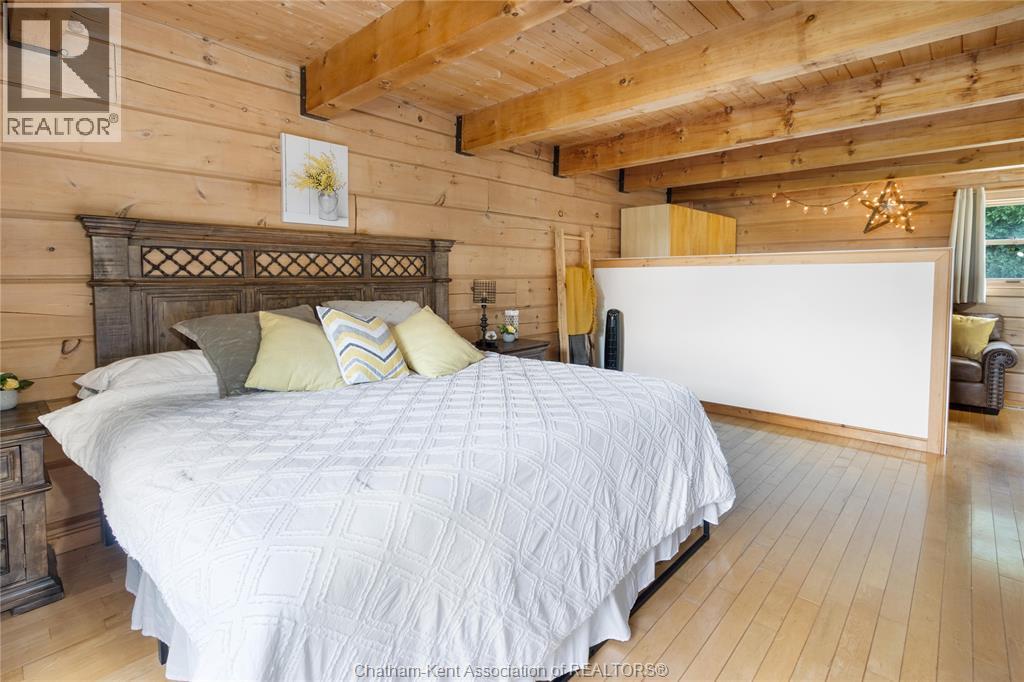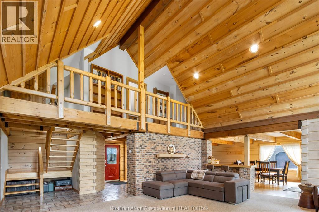 Embrace this impressive Confederation Log Home tucked away in a private retreat offering approximately 500 ft of canal waterfront and sitting on an impressive 2-acre lot. Inside this unique home, you’re met with an exceptional layout featuring a large great room with cathedral ceilings and an open balcony overlooking the space below. You’ll notice the rich wood tones, exposed beams, and detailed joinery showcasing the expert craftsmanship throughout. The massive eat-in kitchen provides plenty of room for large gatherings, dinners, and entertaining, with patio door access to the outdoor area where you can relax and take in beautiful canal views, wildlife and breathtaking sunsets! Enjoy the convenience of main floor living with a spacious primary bedroom offering a roughed-in ensuite with a walk-in closet area. A large foyer, a 2pc bath and laundry room complete the main floor. Upstairs, you’ll find two generous bedrooms and a 4pc bathroom. Outside, there’s room to roam across three parcels of land with a new wood and steel dock! This place really sets the tone for relaxation and enjoying life on the water. With access to Rondeau Bay, you can swim, boat, and fish in world-class waters right from your backyard. The heated oversized double detached garage/shop provides ample space for all your toys, a workshop, or future projects while you enjoy this peaceful and private setting. Services include municipal water, natural gas, septic and well water for your gardening or other uses! This property is truly one-of-a-kind!! Don’t miss your chance to make it yours. Call today for more information or to schedule your private viewing! (id:4555)
