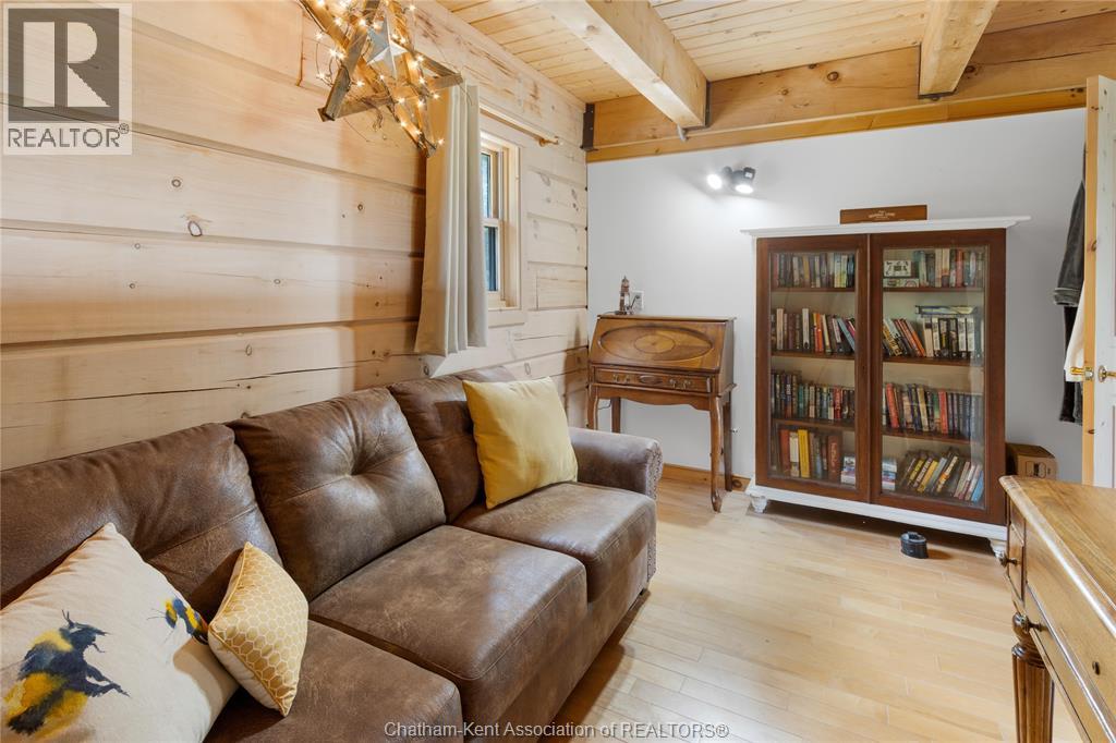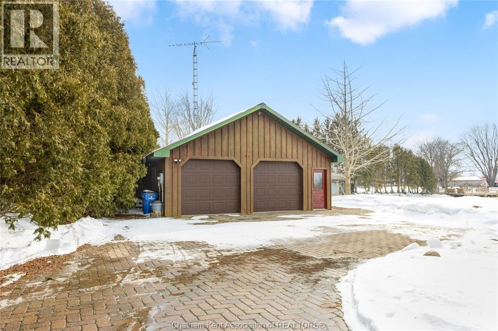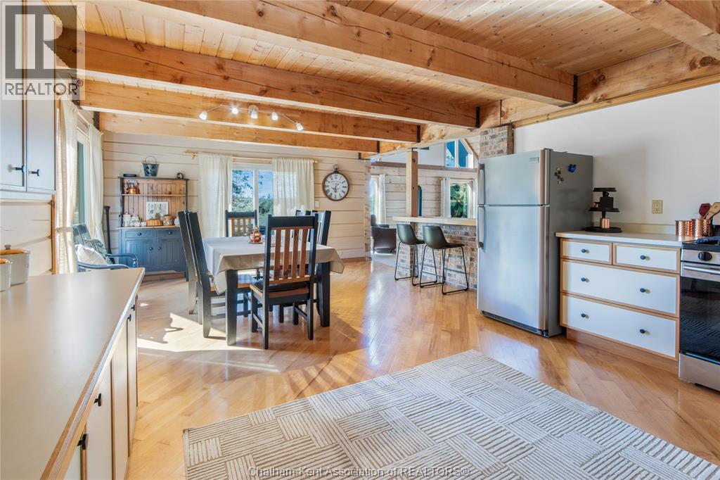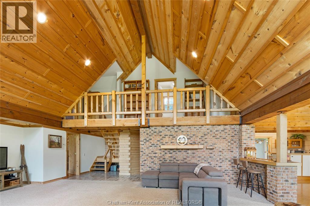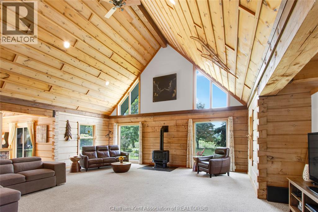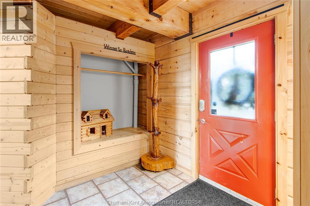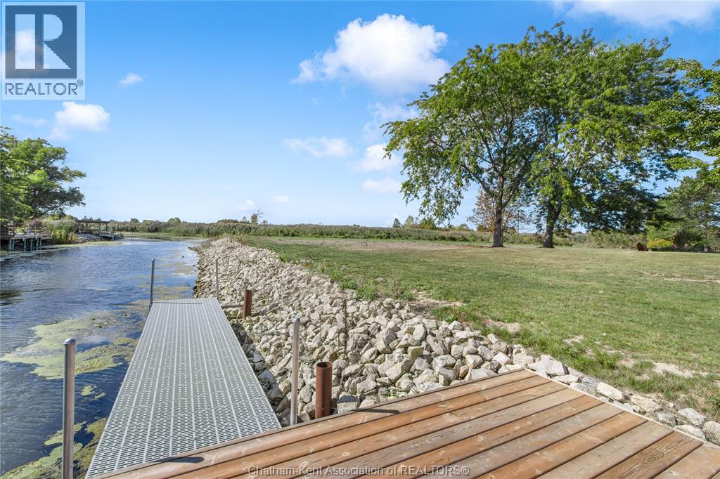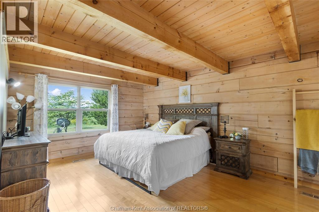 Embrace this impressive Confederation Log Home tucked away in a private retreat offering approximately 500 ft of canal waterfront and sitting on an impressive 2-acre lot. Inside this unique home, you’re met with an exceptional layout featuring a large great room with cathedral ceilings and an open balcony overlooking the space below. You’ll notice the rich wood tones, exposed beams, and detailed joinery showcasing the expert craftsmanship throughout. The massive eat-in kitchen provides plenty of room for large gatherings, dinners, and entertaining, with patio door access to the outdoor area where you can relax and take in beautiful canal views, wildlife and breathtaking sunsets! Enjoy the convenience of main floor living with a spacious primary bedroom offering a roughed-in ensuite with a walk-in closet area. A large foyer, a 2pc bath and laundry room complete the main floor. Upstairs, you’ll find two generous bedrooms and a 4pc bathroom. Outside, there’s room to roam across three parcels of land with a new wood and steel dock! This place really sets the tone for relaxation and enjoying life on the water. With access to Rondeau Bay, you can swim, boat, and fish in world-class waters right from your backyard. The heated oversized double detached garage/shop provides ample space for all your toys, a workshop, or future projects while you enjoy this peaceful and private setting. Services include municipal water, natural gas, septic and well water for your gardening or other uses! This property is truly one-of-a-kind!! Don’t miss your chance to make it yours. Call today for more information or to schedule your private viewing! (id:4555)