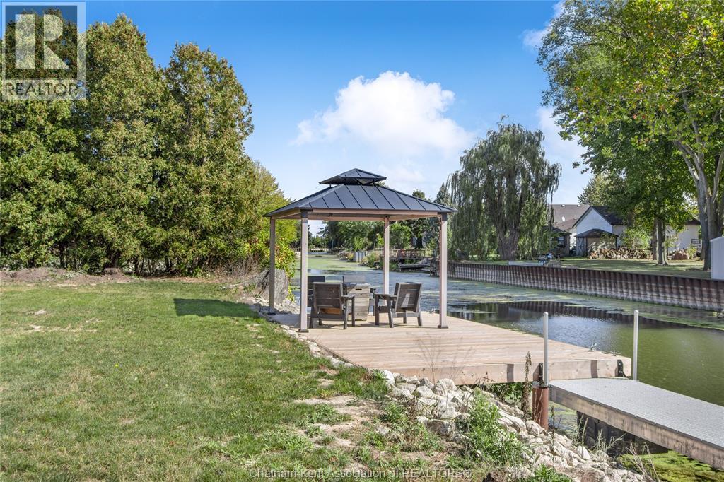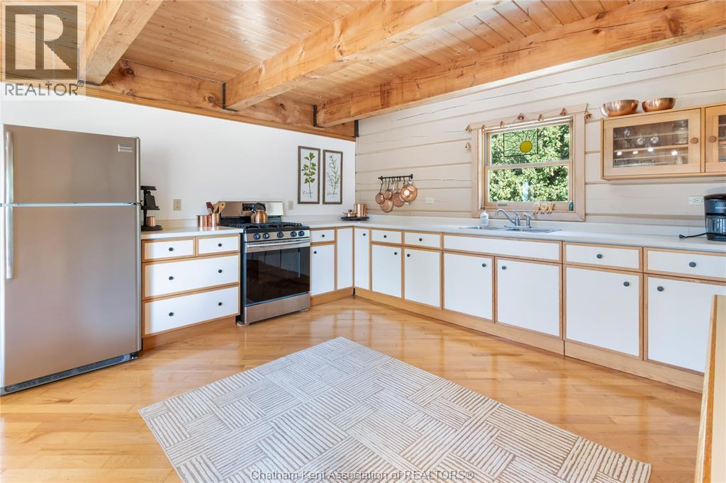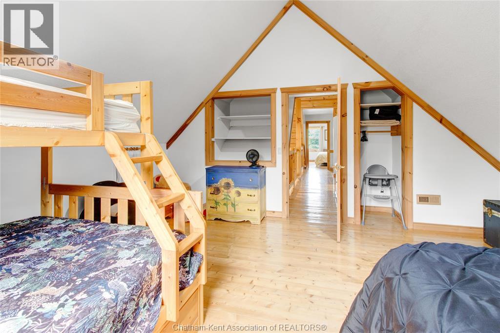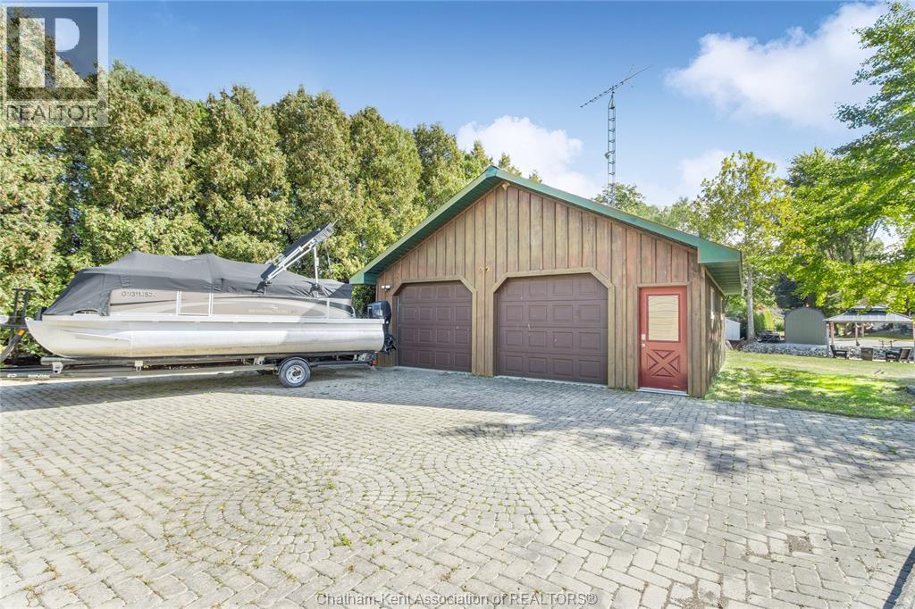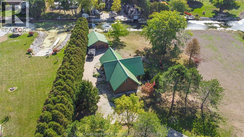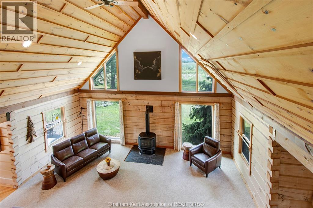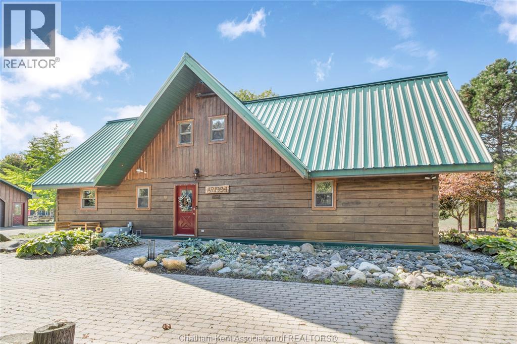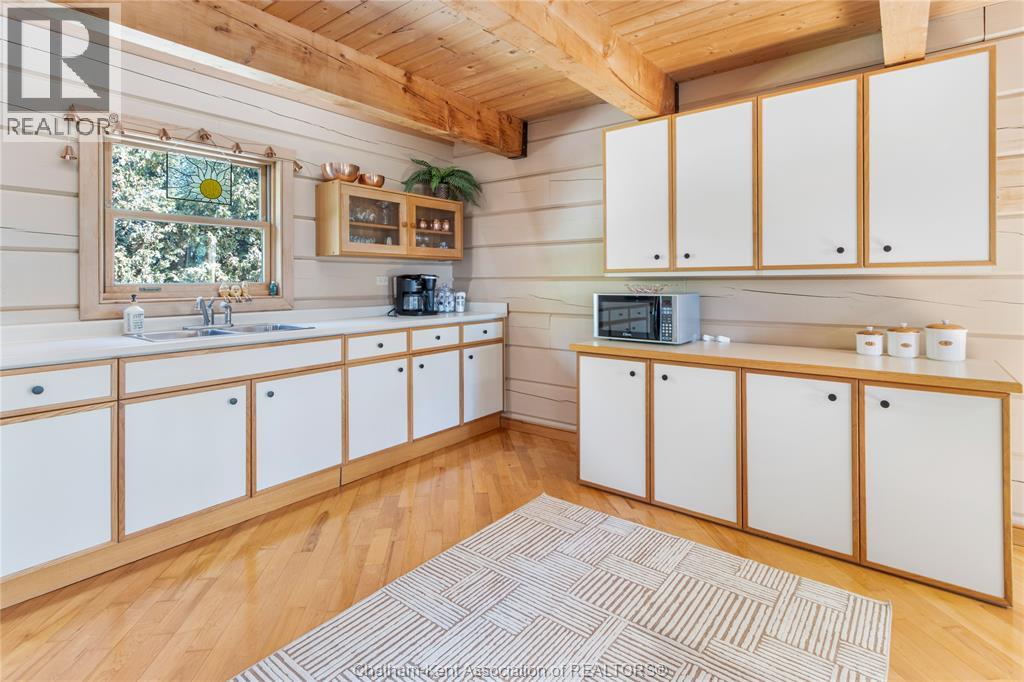 Embrace this impressive Confederation Log Home tucked away in a private retreat offering approximately 500 ft of canal waterfront and sitting on an impressive 2-acre lot. Inside this unique home, you’re met with an exceptional layout featuring a large great room with cathedral ceilings and an open balcony overlooking the space below. You’ll notice the rich wood tones, exposed beams, and detailed joinery showcasing the expert craftsmanship throughout. The massive eat-in kitchen provides plenty of room for large gatherings, dinners, and entertaining, with patio door access to the outdoor area where you can relax and take in beautiful canal views, wildlife and breathtaking sunsets! Enjoy the convenience of main floor living with a spacious primary bedroom offering a roughed-in ensuite with a walk-in closet area. A large foyer, a 2pc bath and laundry room complete the main floor. Upstairs, you’ll find two generous bedrooms and a 4pc bathroom. Outside, there’s room to roam across three parcels of land with a new wood and steel dock! This place really sets the tone for relaxation and enjoying life on the water. With access to Rondeau Bay, you can swim, boat, and fish in world-class waters right from your backyard. The heated oversized double detached garage/shop provides ample space for all your toys, a workshop, or future projects while you enjoy this peaceful and private setting. Services include municipal water, natural gas, septic and well water for your gardening or other uses! This property is truly one-of-a-kind!! Don’t miss your chance to make it yours. Call today for more information or to schedule your private viewing! (id:4555)
